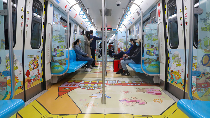 “地铁专列利用车厢的立体空间,以插画手绘风为主要设计风格,将金沙滩啤酒城IP形象——‘哈舅’作为灵魂人物,带领乘客穿梭于六大主题车厢间,共同感受新区魅力,打造了场景化的品牌营销,带给乘客沉浸式体验。”黄发集团策划部工作人员赵益弘介绍。