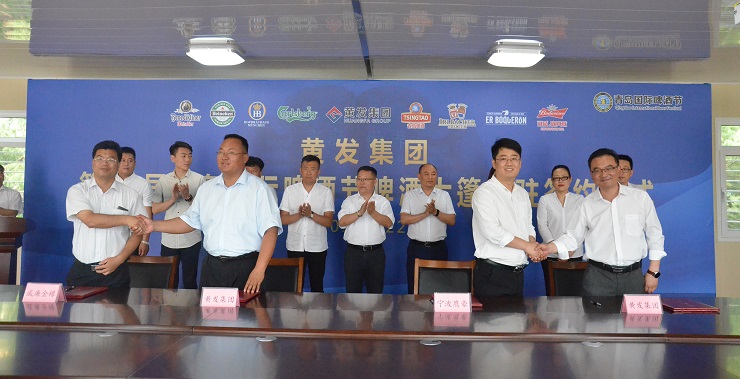 6月22日,黄发集团与8家世界知名品牌啤酒经销商在金沙滩啤酒城举行第28届青岛国际啤酒节啤酒大篷签约仪式。青岛啤酒、西班牙伯爵龙、德国埃尔巴赫、慕尼黑、百帝王、丹麦嘉士伯、美国百威、荷兰喜力等全球知名啤酒品牌齐聚啤酒城,为四海宾朋奉献一场世界级啤酒狂欢盛宴。